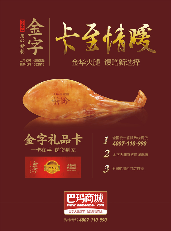 作為一家上市公司——金字火腿推出的禮品卡,禮品卡多年信譽(yù),廣受消費(fèi)者的真心歡迎,每年回頭客無(wú)數(shù),而更重要的是,金字每年把產(chǎn)品的品質(zhì)和備貨做到更好,禮品卡內(nèi)產(chǎn)品都是公司層層品質(zhì)歷練的熱銷產(chǎn)品,用火腿、臘肉、香腸這些實(shí)在心意,去感動(dòng)每一位朋友。如今,更是可以通過手機(jī)微信關(guān)注金字火腿,盡享中華美食同時(shí),與朋友分享禮品卡里所蘊(yùn)含的真情實(shí)意。