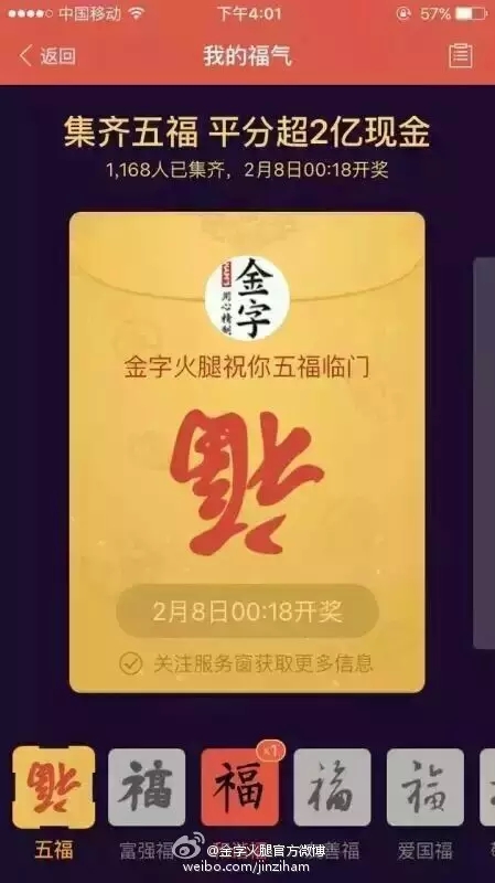 自前幾天支付寶將“集5福,搶2億+紅包”的活動(dòng)規(guī)則公布后,一時(shí)間,有關(guān)??〒Q贈(zèng)的話題強(qiáng)行霸屏。在有金字粉絲集齊了五福后,金字順勢(shì)在微博平臺(tái)上策劃的#我與2億只差一張???的微話題就引發(fā)了高達(dá)4.6億的閱讀量,網(wǎng)友們通過(guò)點(diǎn)贊評(píng)論及轉(zhuǎn)發(fā)分享的方式,第一時(shí)間表達(dá)了自己對(duì)于五福??ê痛和?億紅包的高度期待!