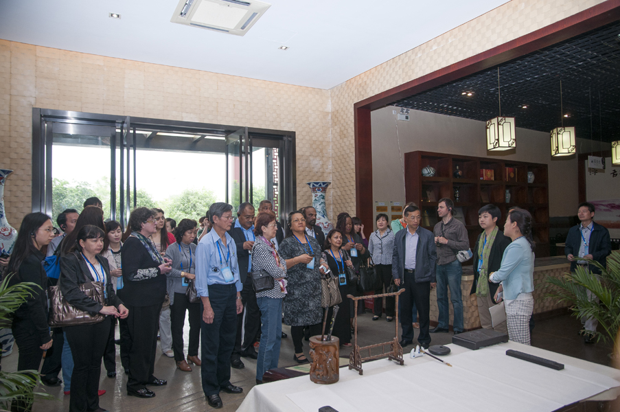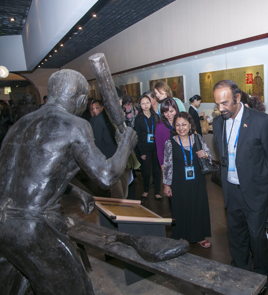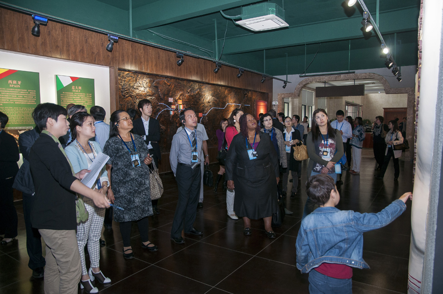 從一進(jìn)中國(guó)火腿博覽館的大門開(kāi)始,使節(jié)們就被眼前精美的浮雕所吸引。透過(guò)金字火腿吳月肖副總經(jīng)理有趣的解說(shuō)和翻譯的詳盡翻譯,50余人才搞明白:原來(lái)這就是著名的《百姓勞軍圖》,而使節(jié)中的一些“中國(guó)通”發(fā)現(xiàn)他們熟知岳飛的師傅宗澤,原來(lái)竟然是金華火腿的祖師爺,火腿原料金華兩頭烏如此有趣珍貴,就好比中國(guó)的熊貓。