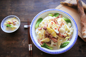 征集消息發(fā)出至今,已有不少市民愿意一秀才藝,其中一位叫楊哥的火腿菜做法,確實也挺讓人腦洞大開。楊哥叫楊春鋼,有著20多年的廚師經(jīng)驗。目前在市區(qū)開了一家籮籮酸湯魚的他,對火腿頗有研究,早在多年前,就開始在外地推廣金華火腿。在楊哥看來,火腿是個好東西,作為一種很好的烹飪食材,它有提鮮增香的作用,還有很高的營養(yǎng)價值,具有多種氨基酸和微量元素,有促進傷口愈合等作用……